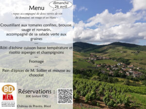 BDMiam et le Domaine du Château de Pravins vous invitent le 26 avril 2026 à partir de 11H à découvrir le domaine et ses vins autour d’un repas convivial. Au programme : Menu complet : Situé à Blacé, le Château de…